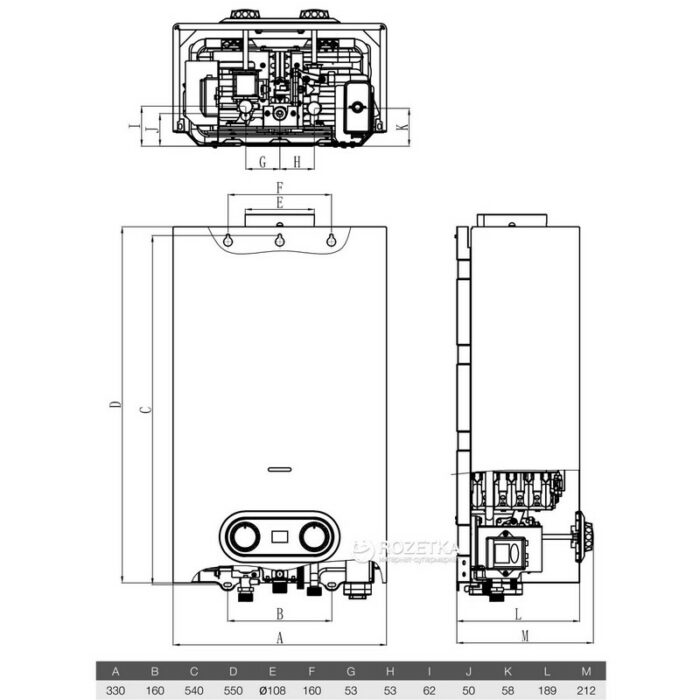 • Диаметр вх./вых. Трубы Диаметр присоединения газовой магистрали: 1/2” | Диаметры патрубков подачи и отбора воды 1/2”