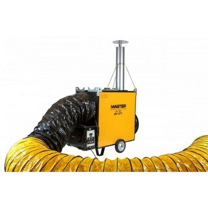 Модель MASTER BV 471 S оснащена отдельной камерой сгорания с горелкой Riello, увеличивающей КПД непрямого нагревателя. Работа агрегата возможна с использованием дизельного топлива либо жидкого газа. Высокопроизводительный осевой вентилятор обеспечивает малошумную работу и создает мощный поток воздуха давлением 250 Па. При необходимости давление можно увеличить до 400 Па (опция под заказ). Мощность нагрева воздуха составляет 136 кВт. Калорифер изготовлен из качественной нержавеющей стали.