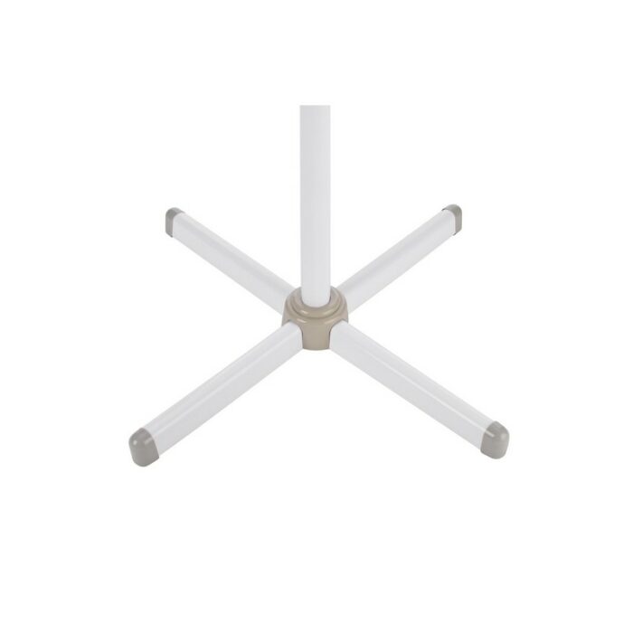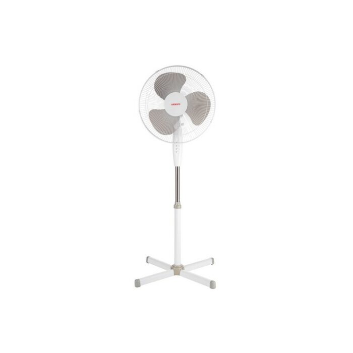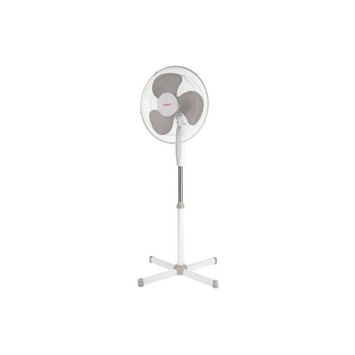 Вентилятор напольный белого цвета с механическим управлением и опорой в виде крестовины. Модель выполнена из надежных, практичных и долговечных материалов – поликарбоната и металла с эмалированным покрытием.