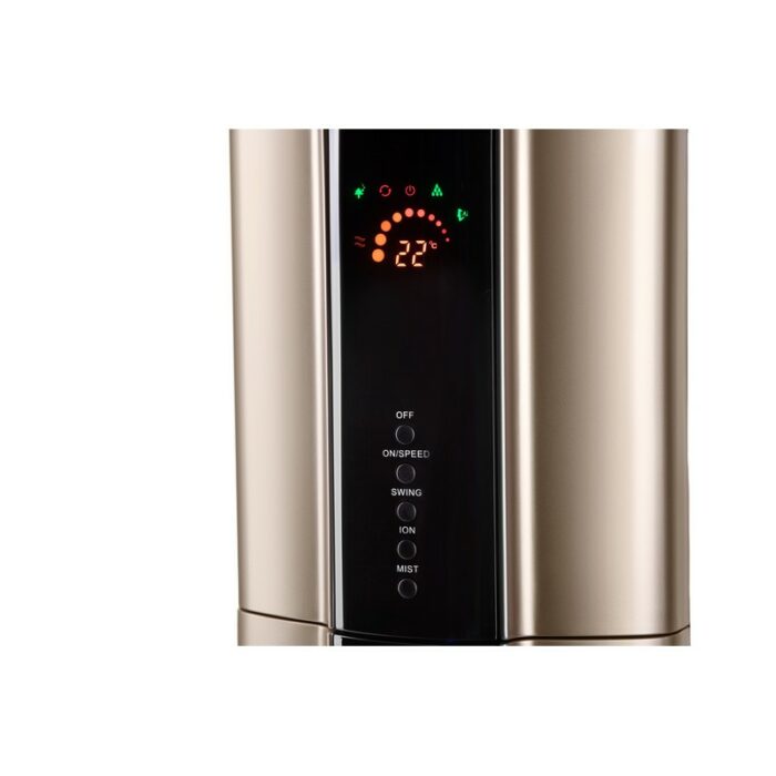 Вентилятор напольный золотистого цвета с функцией увлажнения. Для удобного управления предусмотрен дисплей с цветной индикацией и пульт ДУ. Модель выполнена из надежных, практичных и долговечных материалов, а в качестве подставки используется платформа с колесами.